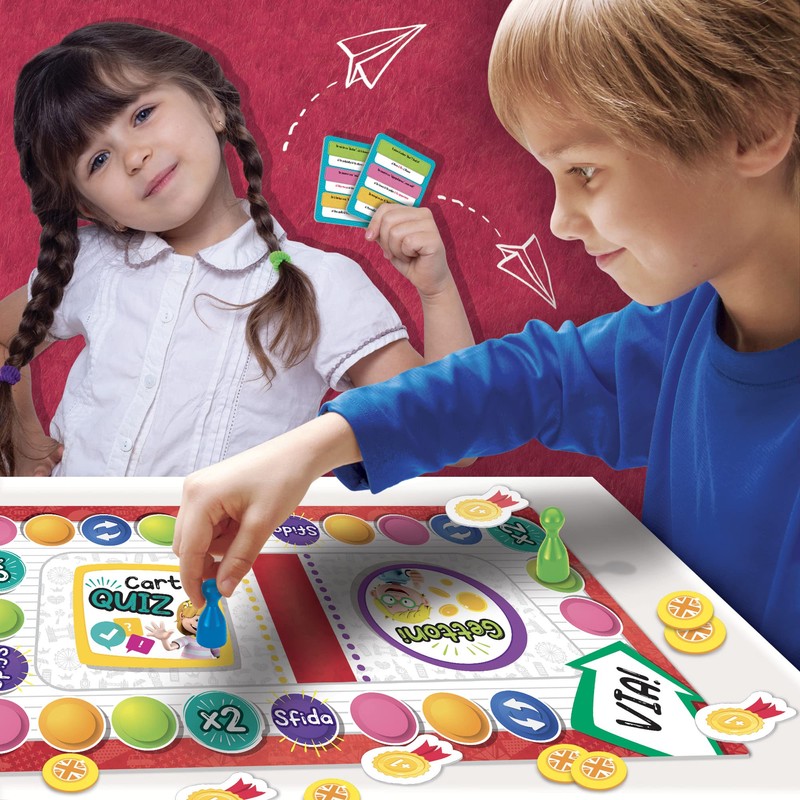 - Educational game in the box, 1 game board, 1 spinner, 16 round chips, 12 bows, 27 special cards, 4 tuning pegs