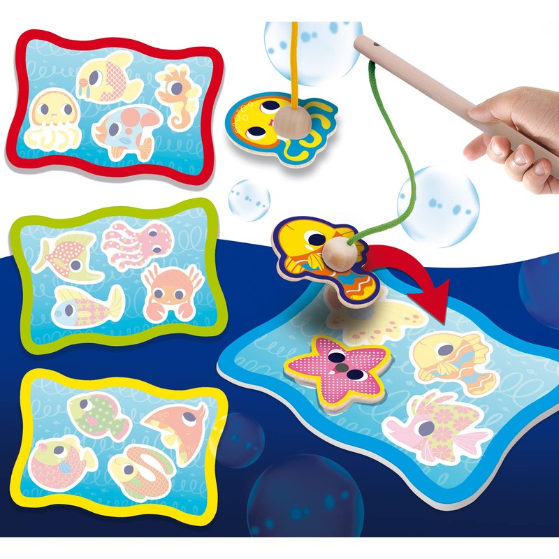 - 3D tray - 16 magnetic fish - 4 wooden fishing rods - 4 bingo cards - Wooden dice