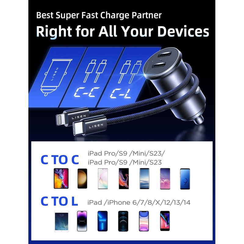 - EXTRA 2-PACK CABLES RIGHT FOR ALL YOUR DEVICES: LISEN iPhone 16 Pro Max USB C car charger fast charging adapter comes with one 60W USB-C to USB-C cable and one 27W USB-C to Lightning cable for you which support super fast charging for your Samsung Galaxy S25/S24/S23 S22 S21 Ultra S20/ Note 20 10 A52 A71 A51 A10E S9, Google Nexus 6P Pixel 5 4xl 3xl 2xl 3a 4 4a, LG, iPhone 16 15 15 Plus 15 Pro Max 16 Pro Max 16 Plus 16 iPhone 13 Pro Max iPhone 12 11 XR XS, iPad Pro Air Mini, Macbook air. Compatible with 12/24V cars, trucks, RV, and etc. This makes it a perfect 12V car adapter and a 12V USB C charger for all your needs.