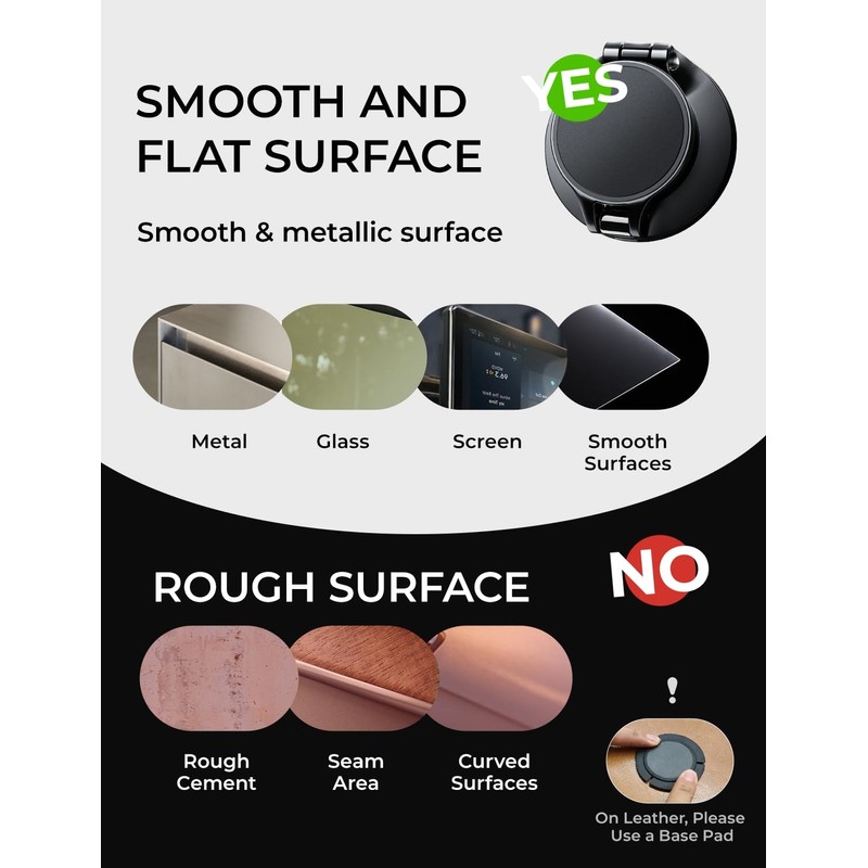 - This car mount is not suitable for use on leather, rough, uneven, or irregular surfaces. Please avoid using it on these types of dashboards. Perhaps you are still wondering if this product is compatible with my phone? This car mount is compatible with the entire iPhone 16 / 15 / 14 / 13 / 12 series. Additionally, you can install a magnetic sheet on your phone or phone case to adapt to this car mount. However, please note that if your phone case has an uneven surface or is made of leather, it may not be suitable for traditional magnetic sheets