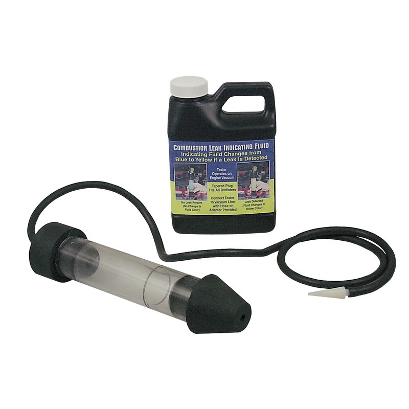 Quickly Pinpoints Combustion Leaks. Checks for combustion leaks caused by bad head gaskets, cracked blocks, and cracked or warped heads. Fluid changes from blue to yellow when exposed to combustion gases from the radiator. Connect the hose to any vehicle vacuum line. Or, on tools made after June 2002, use the adapter with no cross hole with a hand vacuum pump. Place tapered end of tool into radiator opening. With the engine running, the vehicle vacuum or the vacuum pump draws vapors through the indicating fluid for testing. Patent: 6,806,092