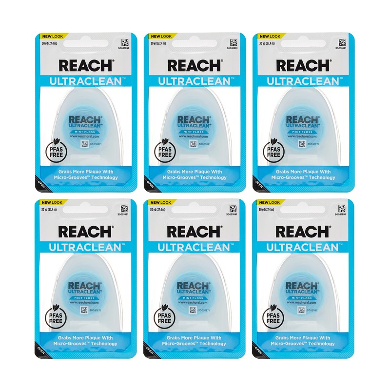 REACH Ultraclean Dental Floss, Mint, Plaque Remover for Teeth, Shred Resistant, Waxed, Easy on Gums & Teeth, Mint, Oral Care, PFAS Free, for Adults & Kids, 6 Pack, 30 yd