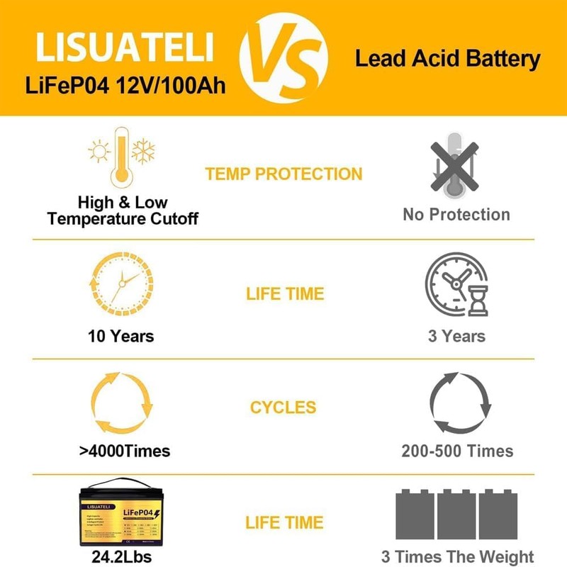 - ➤[High-quality battery] LISUATELI 12v lithium battery adopts high-grade lithium iron phosphate battery, which can assist 12v battery to achieve more cycles and longer service life. It is 8 to 10 times that of lead-acid batteries of the same capacity. More suitable for replacing traditional SLA batteries. There is no memory effect, no matter what state the battery is in, it can be used as long as it is fully charged.