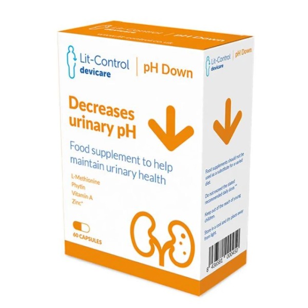 Το Lit-Control pH Down είναι ένα καινοτόμο συμπλήρωμα διατροφής σε μορφή καψακίου, που αποτελείται από έναν παράγοντα οξίνισης, την L-μεθειονίνη, που συνιστάται από Ευρωπαϊκές κατευθυντήριες γραμμές για την ουρολογία, και έναν αναστολέα της λιθίασης ασβεστίου, τα φυτικά οξέα.