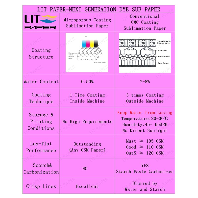 - INSTANT DRY , HIGH TRANSFER RATE&INK SAVING:LIT paper has the high ability to absorb and store the sublimation ink, work like a sponge, very quickly and precisely,then the ink physically released exactly in the position printed. The special structure and minimum water determine the drying time saving, higher transfer rate and precision plus greater ink saving.