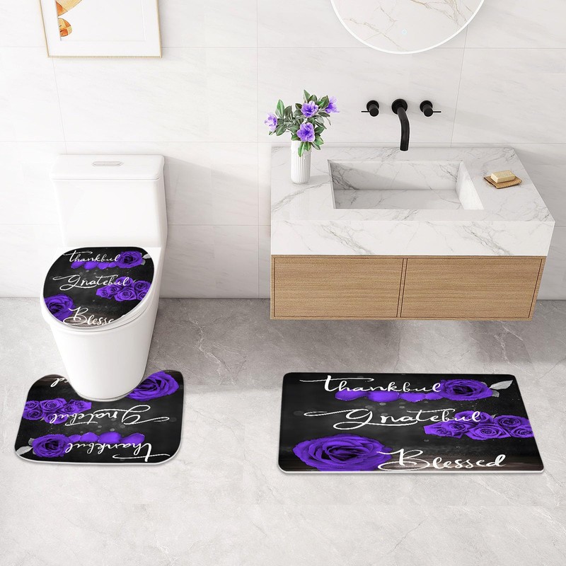 Litabel 4 Pcs Purple Rose Shower Curtain Set with Non-Slip Rugs, Toilet Lid Cover and Bath Mat, Thankful Grateful Blessed Romantic Showy Elegant Floral Bathroom Decor Set with Shower Curtain and Rugs