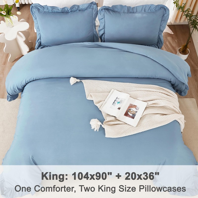 Litanika Grayish Blue King Size Comforter Set, 3 Pieces Ruffle Farmhouse Aesthetic Bedding Comforter Set, All Season Soft Lightweight Fluffy Microfiber Bed Set(104x90In Comforter, 2 Pillowcases)