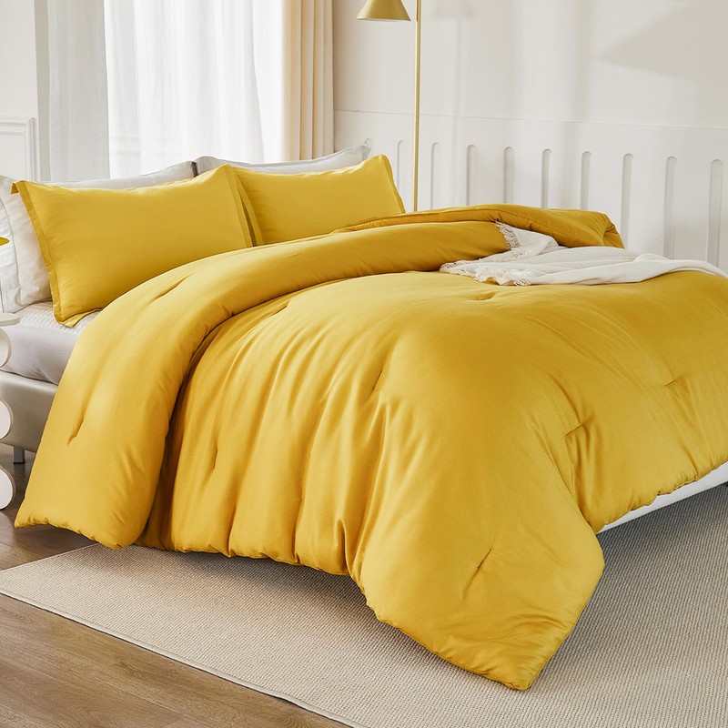 Litanika Mustard Yellow Comforter Set King Size, 3 Pieces Lightweight Solid Bedding Comforter Set, All Season Fluffy Bed Set (104x90In Comforter & 2 Pillowcases)