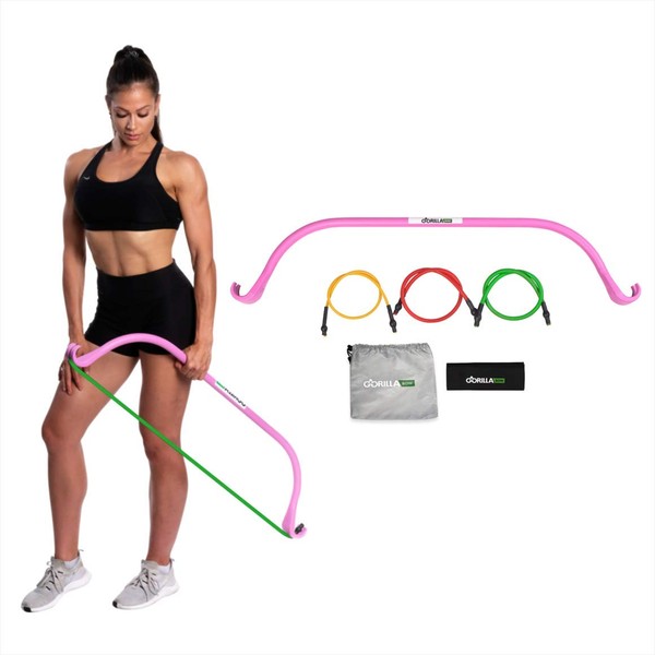 Gorilla Bow Lite Exercise Bow with Resistance Bands Workout Equipment for Legs, Arms, Waist, Shoulders and Back, Portable Home Exercise Equipment for Men and Women (Lite Bow, Pink, Base Bundle)