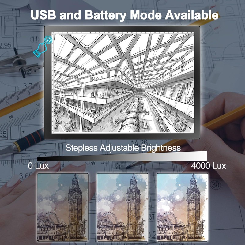 - Rechargeable Battery Powered - This light tracing box let you enjoy the convenience of working wirelessly at anywhere you like with the built-in battery, works for approx 3.5 hours after fully charged. Battery and USB mode are both available.
