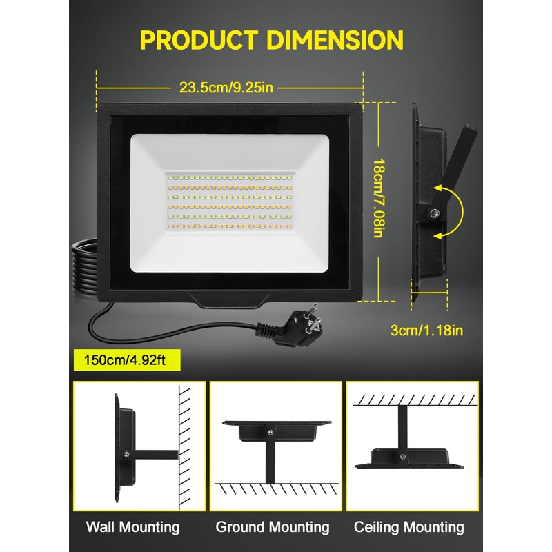 - Super bright and energy saving: the LED floodlight adopts SMD 2835 LED lamp beads, 100 W full power burst, 10000 lm brilliant light, let your yard, garden instantly transform into a nightly wonderland. Compared to conventional halogen lamps, we save you more than 85% of your electricity bill, illuminate the future and your wallet even more.