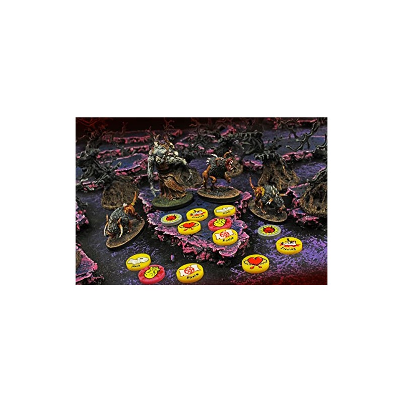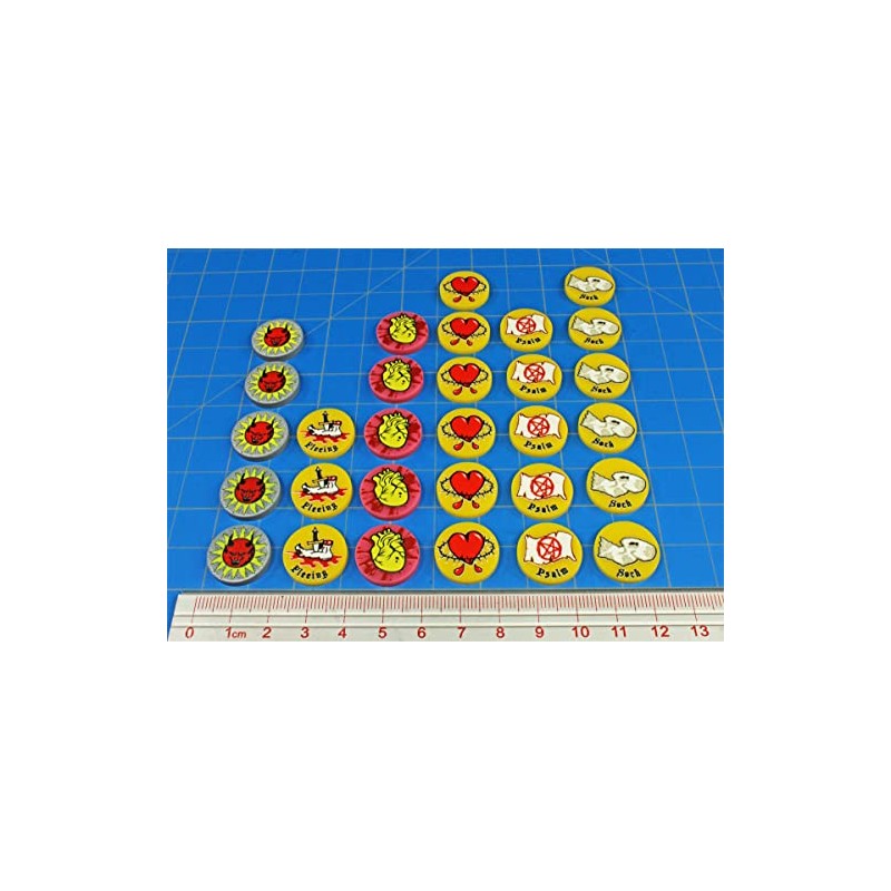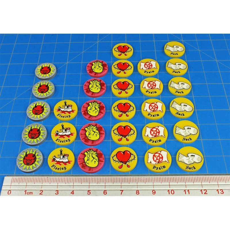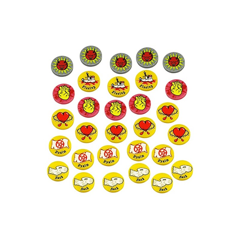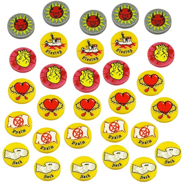 • This set includes (5) Carried Treasure - Evil sun tokens placed next to your model. (3) Fleeing - Stabbed foot tokens when the horrors are too much. (5) Harvested Organ - Jaundice heart tokens; claim the objective. (6) Hit Points - Bleeding heart tokens to track your doomed adventurer's health. (5) Psalm Passage - Cursed scroll tokens; feed the mad wizard's desire. (6) Socks - Dirty sock tokens; rescue the stolen socks.