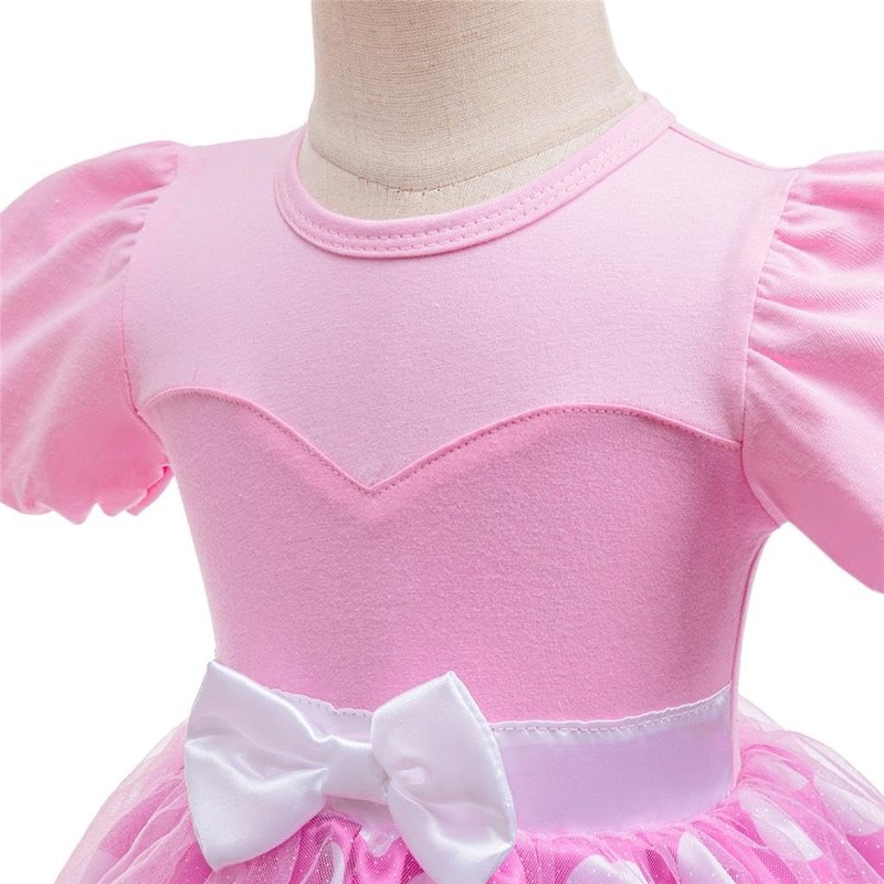 - Cotton bodice with white bow at the waist. Round neck and short puff sleeve. Puffy and soft tulle skirt with printed polka dot matching the character.