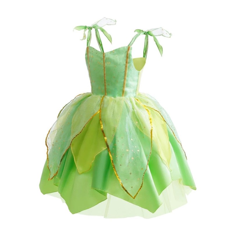 - Ärmelloses Oberteil mit Trägern zum Binden an den Schultern. Die Organza-Miederauflage ist überall mit einem schimmernden goldenen Punktmuster versehen. Knielanges grünes Feenkleid, bestehend aus 2 Lagen Blütenblatt-Organza über dem Satinrock. Die unterste Schicht ist ein mit Baumwolle gefütterter Unterrock mit Netzstoff, der das Kleid bauschiger macht. Kombinieren Sie es mit glitzernden Feenflügeln, um den Tinker Bell-Look zu vervollständigen!