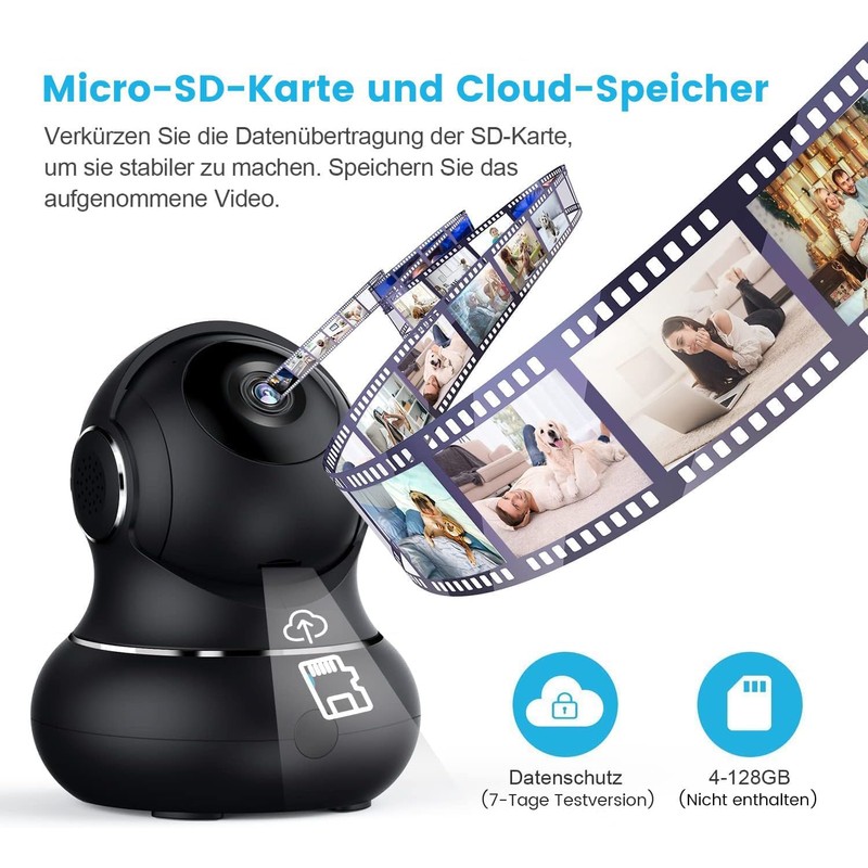 - Sichere Daten SD & Cloud-Speicher Sie k?nnen den Aufnahmemodus dieser wlan kamera einstellen, es gibt eine kontinuierliche oder bewegungserkannte Option. Mehrere Sicherheitsprotokolle, um Ihre Daten und Privatsph?re zu schtzen.Micro-SD-Karte (separat erh?ltlich) oder Cloud-Abonnementdienst (7 Tage Testversion).