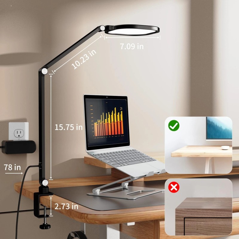 - FULLY ADJUSTABLE POSITIONING SYSTEM: This swing arm desk lamp with clamp features 5 smooth pivot joints reaching 33 inches tall, with a 7-inch lamp head that rotates 360. The minimalistic yet sturdy clamp saves valuable workspace, perfect for small spaces like college dorms, computer home offices or various detailed tasks workspace, its industrial-grade pivots survive 200,000+ adjustments. Position it overhead for bedroom reading, angle it for living room tasks, or extend it for craft table projects - lighting that moves with your needs.