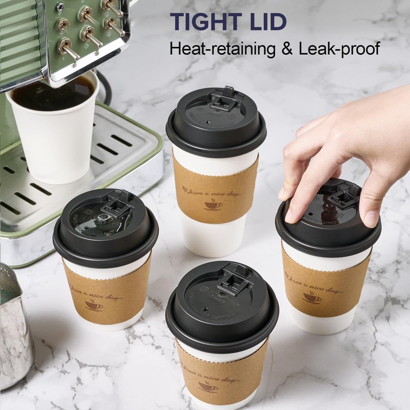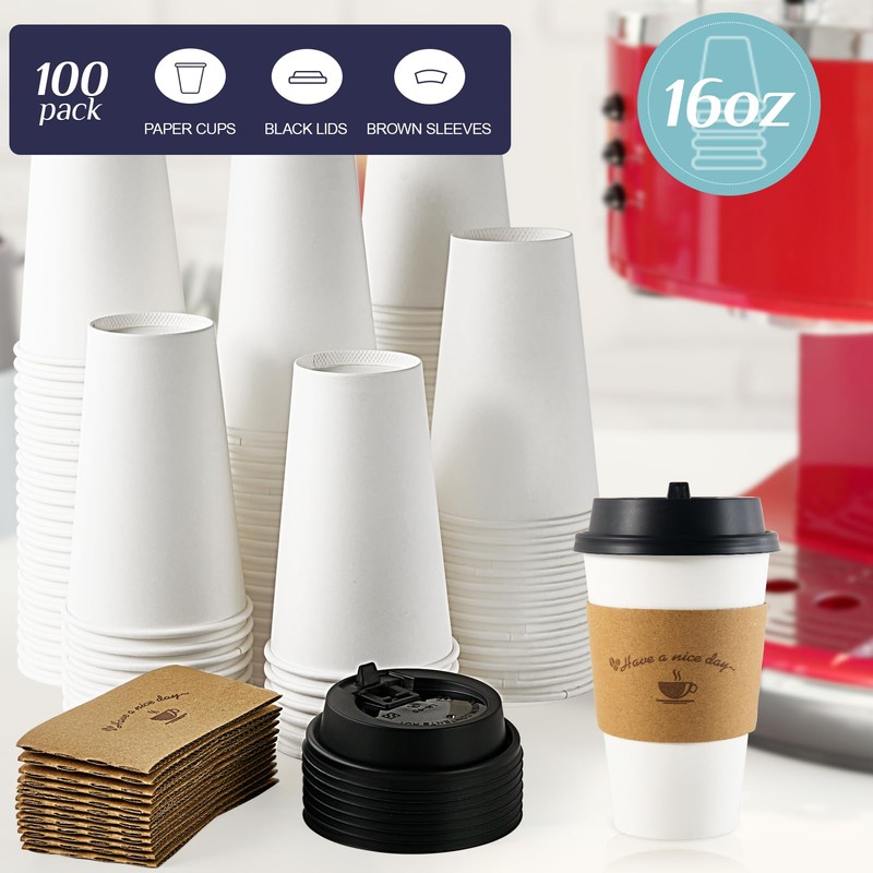 - [Complete Coffee Cup Set]This pack of 100 16 oz disposable coffee cups also includes lids and sleeves. Our hot coffee cups with lids are the ideal medium capacity for a variety of hot drinks.