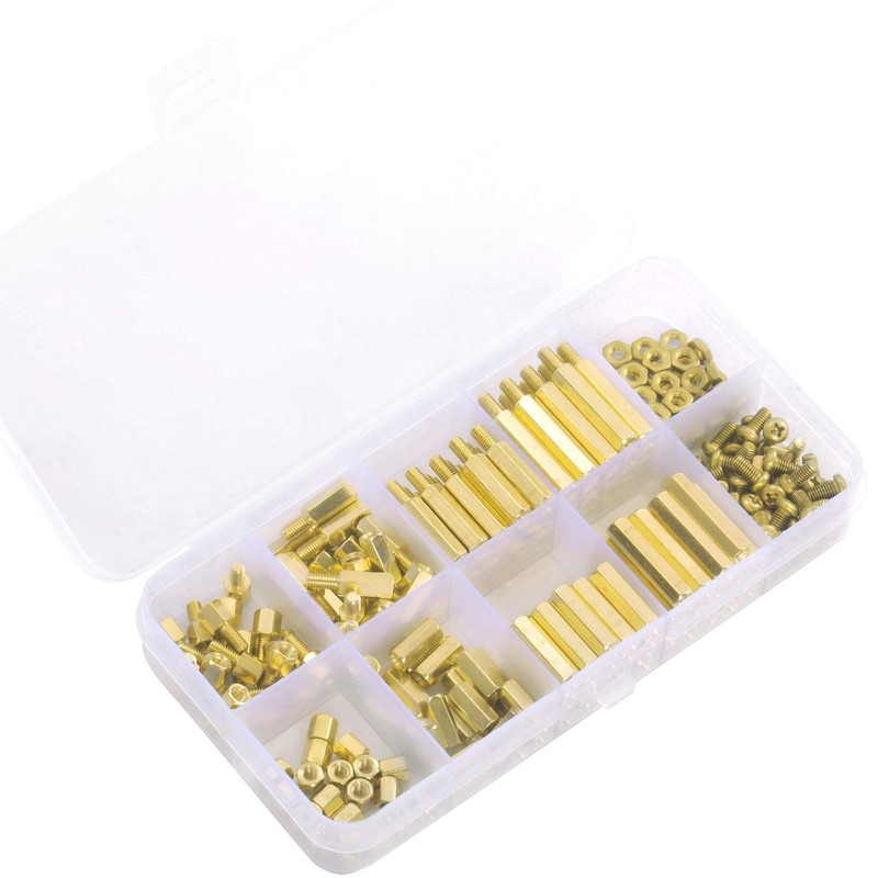 - Set Contents: Female copper pillars, male copper columns and screws, nuts, total of 180 pieces. Diameter: M4 Brass Spacer Color: Brass Color With case: 1*plastic box