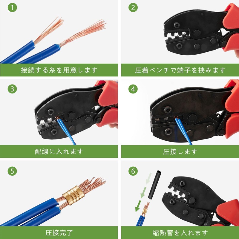 - Set Contents: Straight terminal: 0.5 - 1.5 sq (100 pcs), Splice terminal: 0.5 - 1.5 sq (100 pcs), Splice terminal: 1.5 - 3 sq (80 pcs), Splice terminal: 3 - 6 sq (60 pcs), Splice terminal: 6 - 10 sq (40 pcs). 380pcs Heat Shrink Tubing: Φ0.2 inch (6 mm), Length 1.8 inch (45 mm) (100 pieces) Total 480 pieces