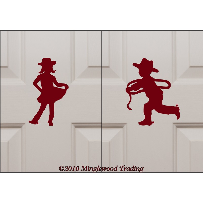 Little Cowboy & Cowgirl 7.5" x 5" Vinyl Decal Stickers Bathroom Door Set - Boys Girls Restroom - Soft Pink