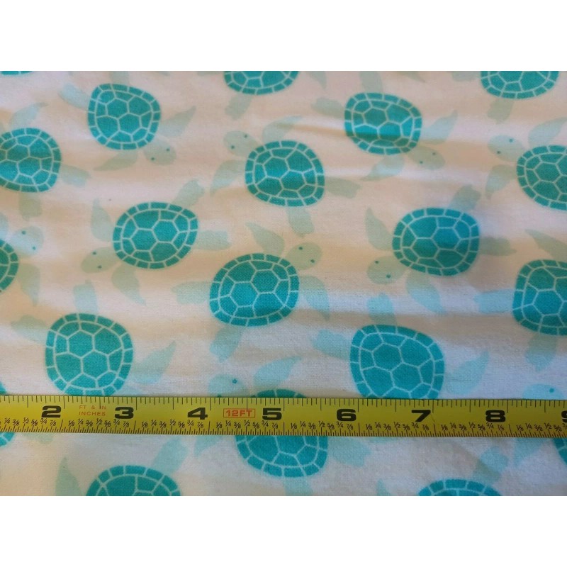 - "Sea Turtles" which has turquoise turtles swimming about on a white background.