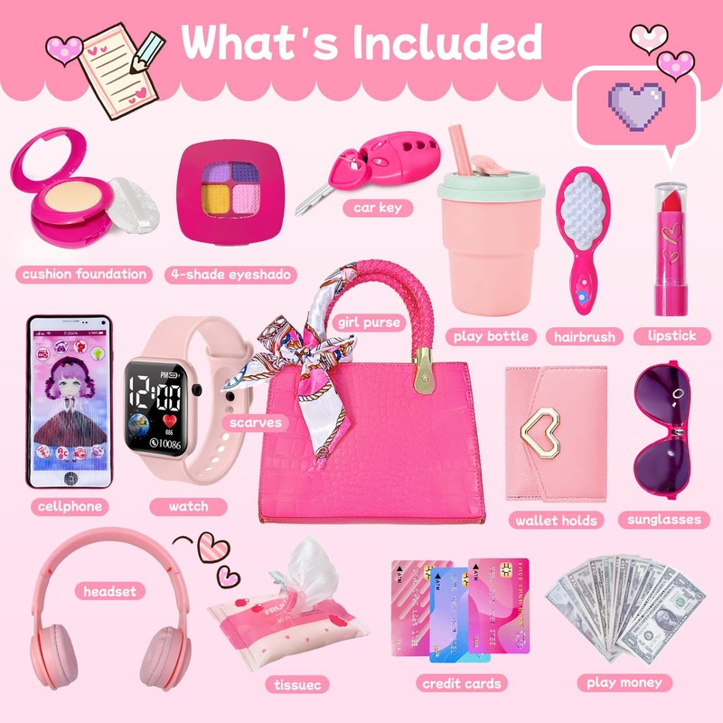 - ❤Quality Assure - Our purse kit is made of durable and long-lasting material, also the makeup toys look real but won’t make any messy which keeps your daughter happy and engaged in imaginative play for endless hours.