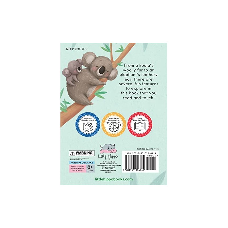 From a koala's woolly fur to an elephant's leathery ear, there are five fun textures to explore in this book that you read and touch! Includes fun, rhyming text about each animal and touch and feel material on every spread. There are a total of five touch and feel elements that will make children want to come back to read this fun book over and over.