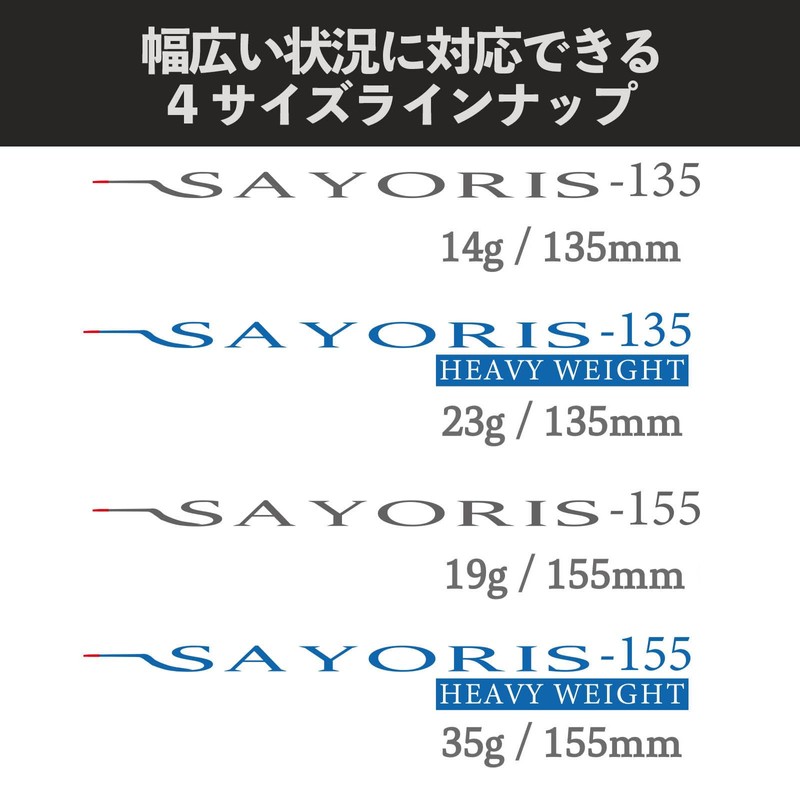 - Two body sizes: 135mm and 155mm The lineup includes two sizes: 135mm, the orthodox size, and 155mm, which targets blue fish outside the bay. Normal weight model and heavy weight model The lineup includes a normal weight model and a heavy weight model to match a wider range of situations. It also supports dead slow action with different fall speeds.