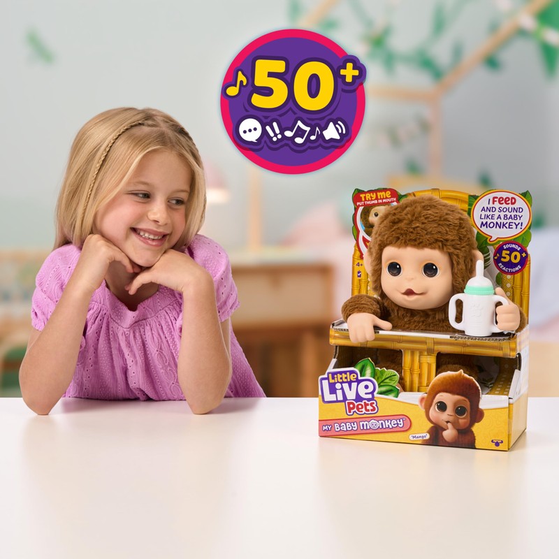 Little Live Pets My Baby Monkey Mango, 50+ Sounds and Reactions, Plush Interactive Monkey Toy Set with Accessories, Interactive Pets for Kids Ages 4+