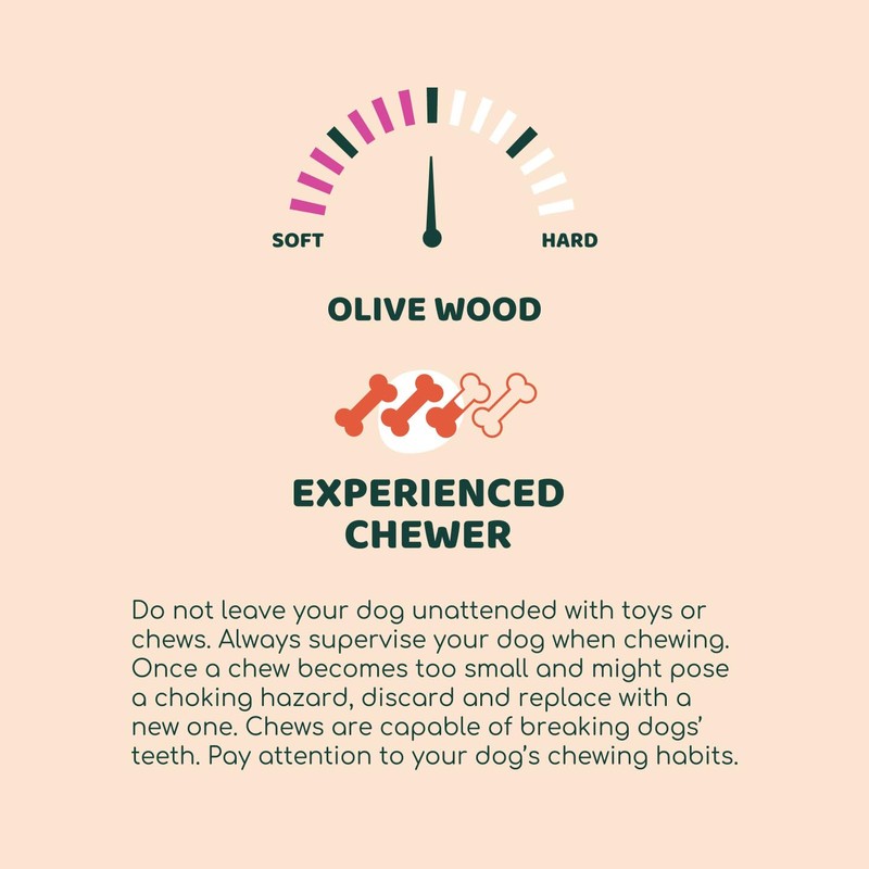 - 100% natural olive wood dog chew is sustainably harvested from Mediterranean olive fields.