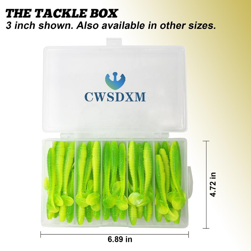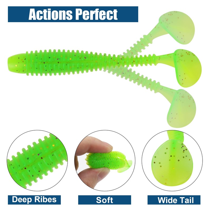 - 🎣 [SPECIFICATION]:6cm/2.5 inch - 75 PCS in one box. 7.5cm/3 inch - 60 PCS in one box.This soft bait is made of soft rubber and is extremely elastic.It has a natural swinging and realistic movements.It is universal in all waters and is not limited to freshwater or saltwater.The bait body is soft and the probability of hanging the bottom is small.