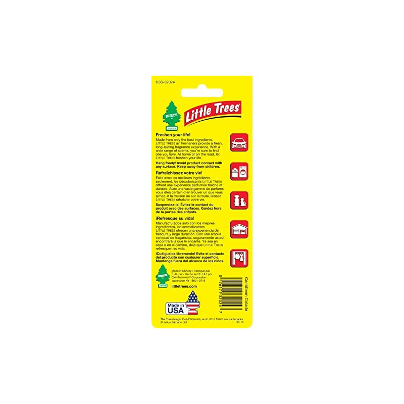 Little Trees U3S32024 Car Air Freshener - Caribbean Colada Scent - 3 Trees per Package. Caribbean Colada - An escape to a tropical island with juicy pineapple and sweet coconut. Highest quality Long lasting Exceptional value Use in car, home or office.