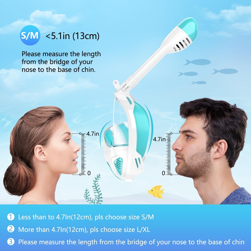 - Size selection: The size of the snorkel mask is measured from the nose bridge to the bottom of the chin, if less than or equal to 4-4.72 inches (10-15 cm), choose size S/M. It fits adults, children, men or women.