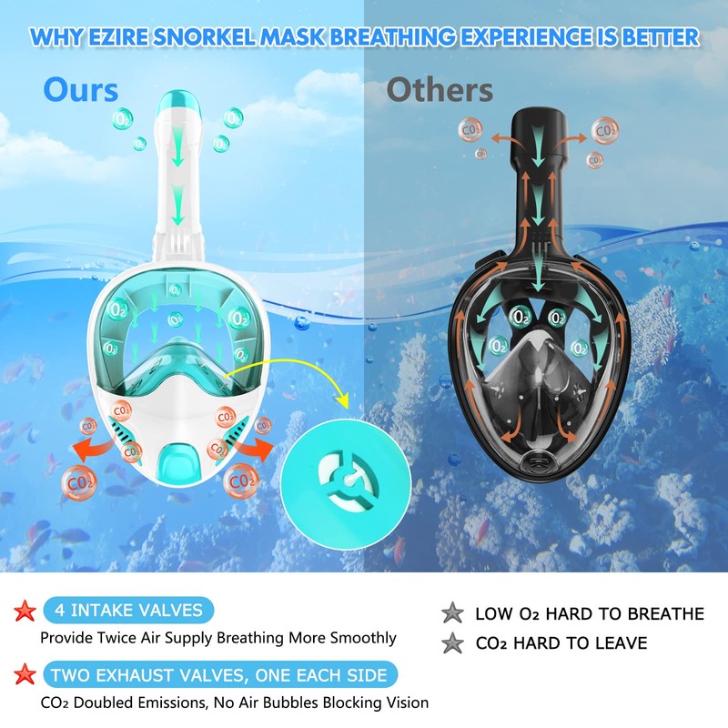 - Anti-fog and anti-leak: Separate inhalation and exhalation channels prevent the top snorkel mask from fogging, and the anti-fog coating on the lens and anti-fog inserts guarantee an anti-fog effect; advanced leak-proof silicone sealing mask with floating ball prevents salt water from entering the mask.