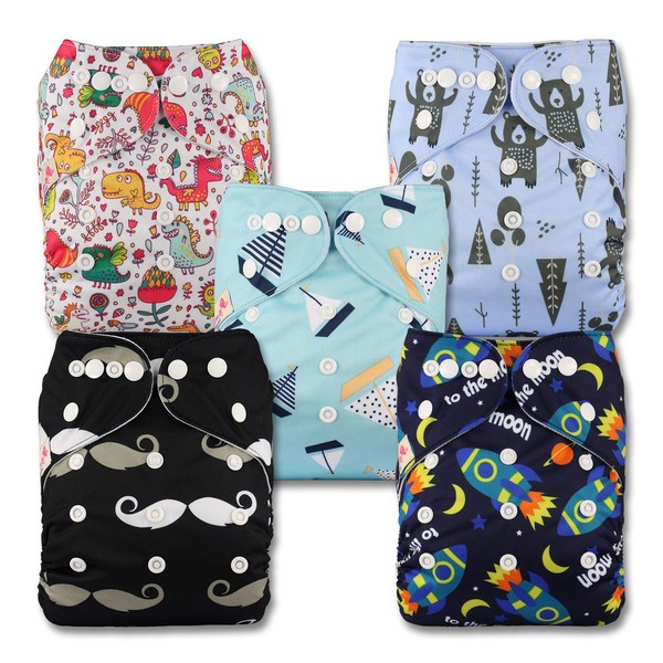 Littles & Bloomz, Reusable Pocket Cloth Nappy, Fastener: Popper, Set of 5, Patterns 504, with 5 Bamboo Charcoal Inserts