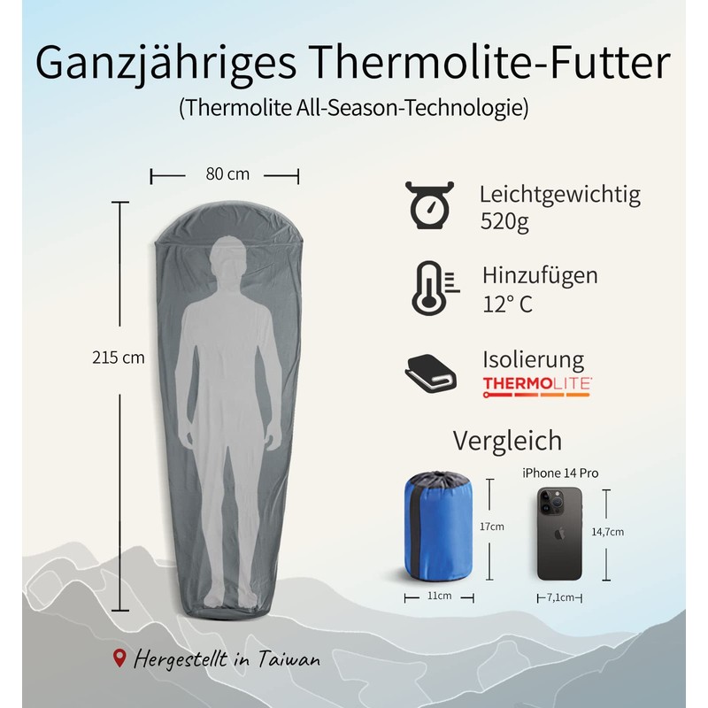 - We use 100% Thermolite fabric (158 g/m²). Thermolite hollow fibre traps more air in the fibre to act as a thermal insulation layer and effectively retain body heat. With the drawstring hood and foot box design, you can sleep warm and comfortable all night long. Thanks to the lightweight carry bag, you can take it anywhere.