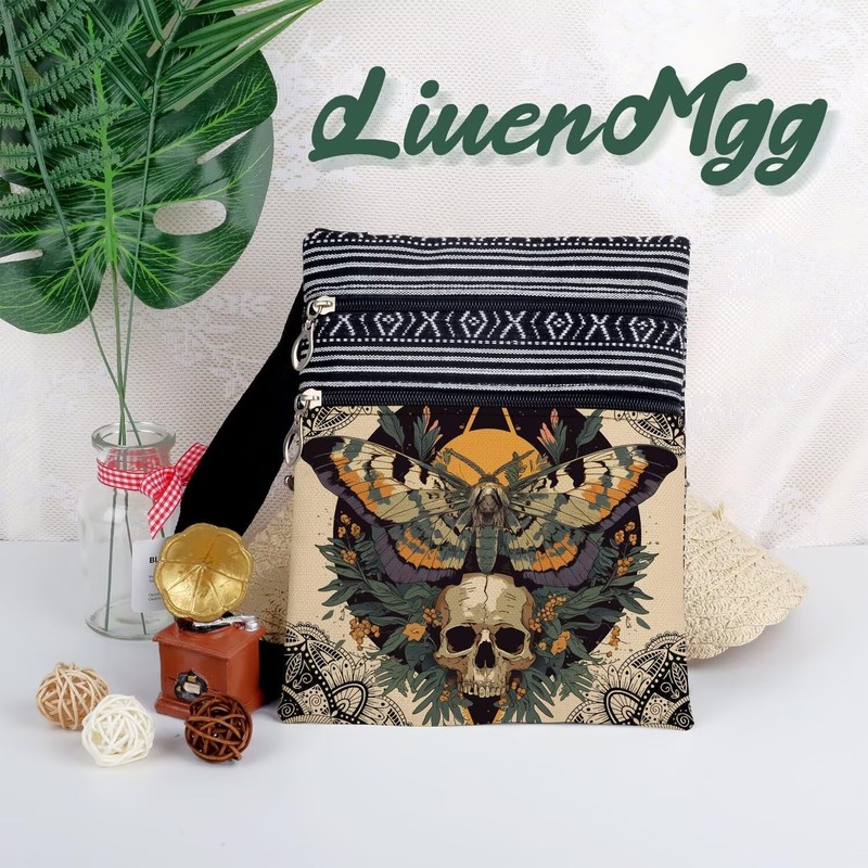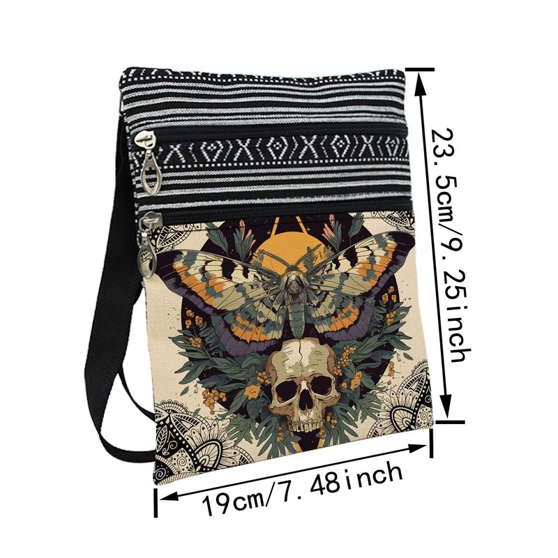 - 3. [Design] The Skull Butterfly Crossbody Bag has a vivid printing effect. On the front side, different bags has different patterns. On the back side, the bags have ethnic patterns. Due to manual cutting, the ethnic patterc patterns may vary. Bags have brown lining, not easy to get dirty. Two pockets help you to better organize personal effects and the straps won't be too thin to hurt your shoulders.