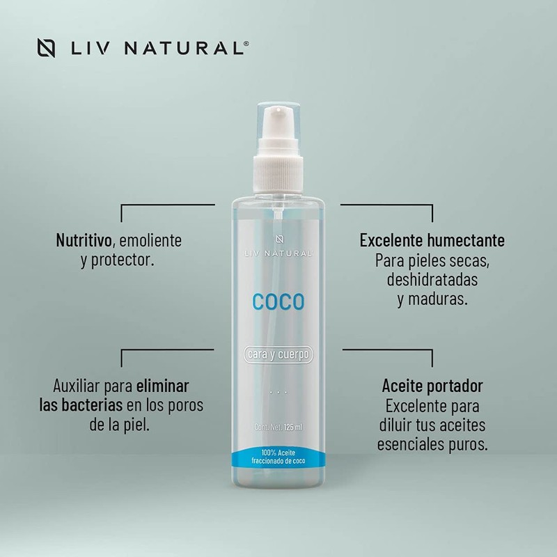 - El aceite de Coco fraccionado es más fácil de absorber y procesar por nuestro cuerpo debido a que contiene ácidos grasos de cadena media y corta. Esta característica lo hace más resistente a la oxidación y mucho mas estable.