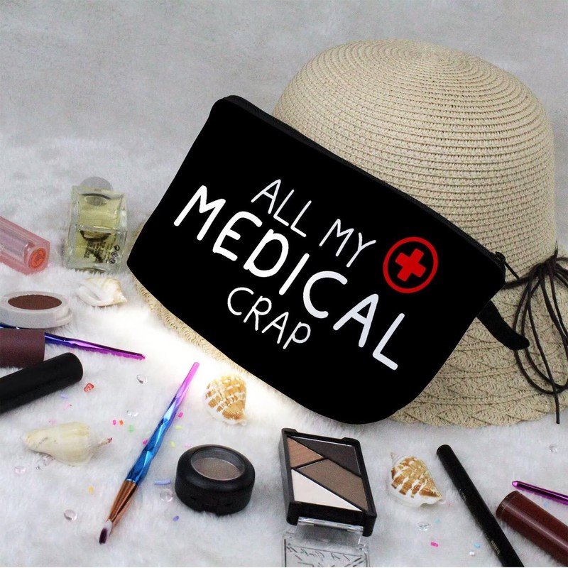 - 3.Good Size:8.65 in* 2 in* 5.35 in. 25 grams weight. The All My Medical Crap cosmetic bag is easy to carry makeup tools like lipsticks, eye shadows, brushes, sunscreens, etc. The makeup bag is also able to carry stationery, medicines, coins, cards and other personal effects