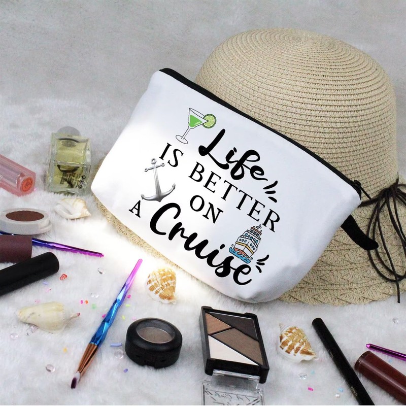 - 3.Good Size:8.65 in* 2 in* 5.35 in. 25 grams weight. The Life Is Better On A Cruise cosmetic bag is easy to carry makeup tools like lipsticks, eye shadows, brushes, sunscreens, etc. The makeup bag is also able to carry stationery, medicines, coins, cards and other personal effects