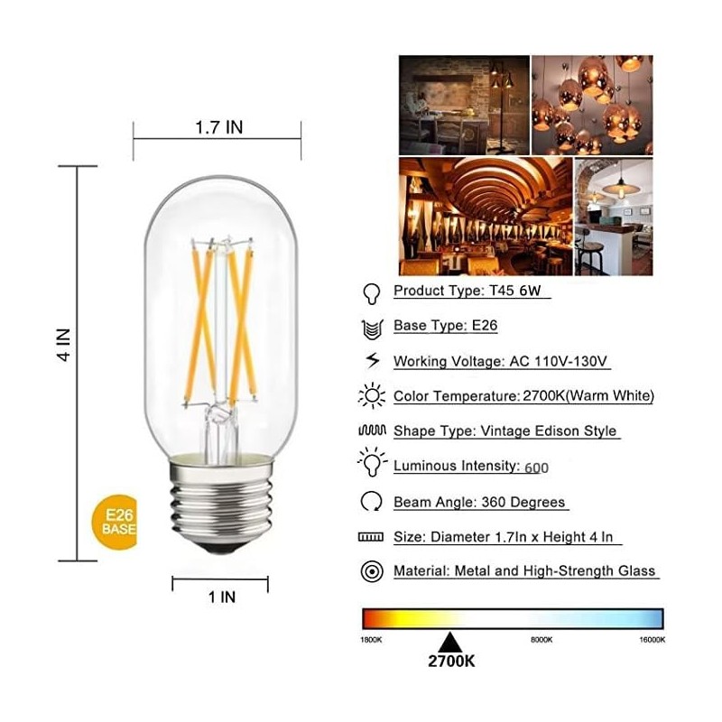 - TECHNICAL FEATURES -LED Filament Candle,E26/27 Edison Base,120VAC,Transparent glass,T45 Bullet Top,Cold White 5000K,600 Lumens,270 Degrees Beam Angle.