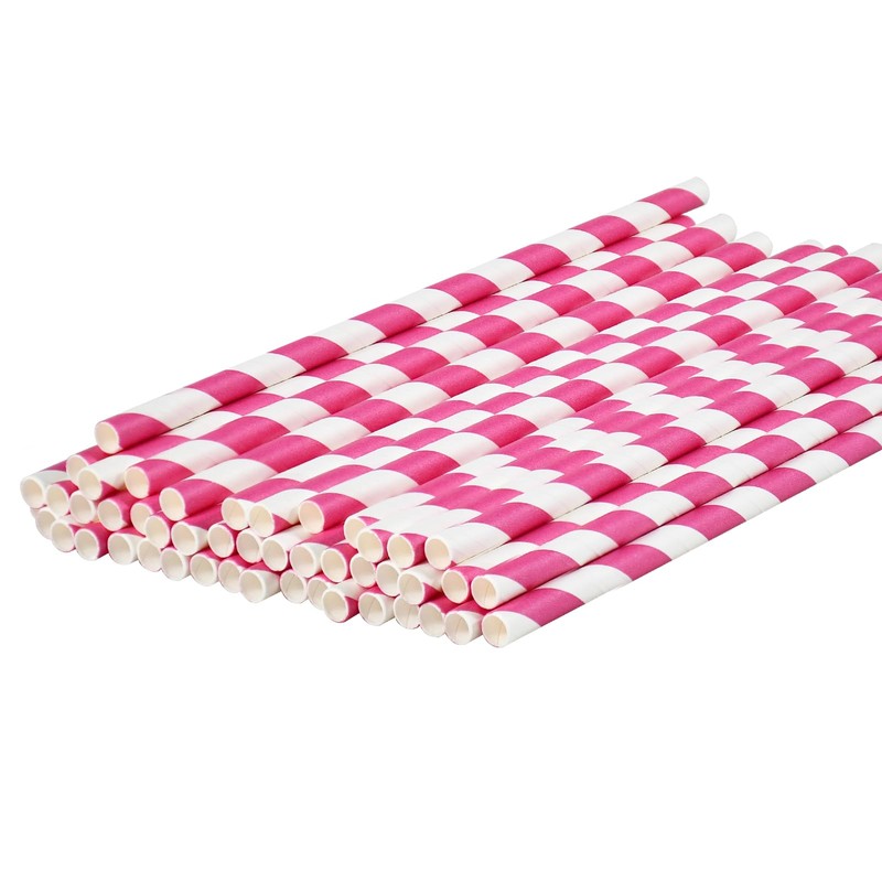 Lives on Green 7.75 inch Hot Pink Striped Paper Straws for Drinking - Unwrapped, 100 Counts - for Party, Wedding, Cocktail, Beverage