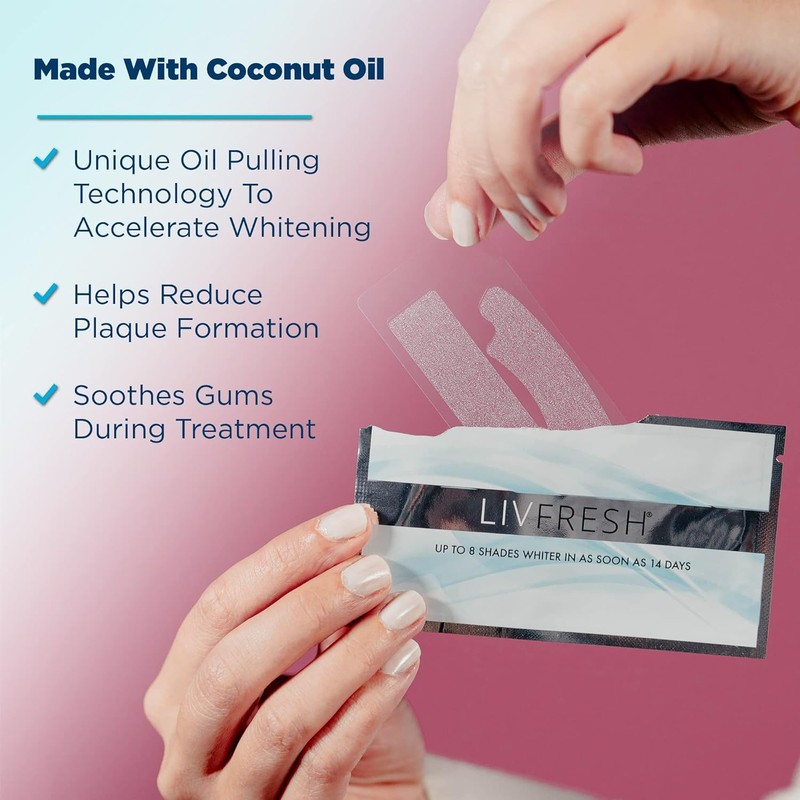 - CLEANS TEETH & REDUCES PLAQUE - Our unique oil pulling technology uses coconut oil to soothe gums and reduce plaque. Plus, LIVFRESH Whitening Strips are supercharged with hydrogen peroxide to eliminate plaque, protecting your teeth.