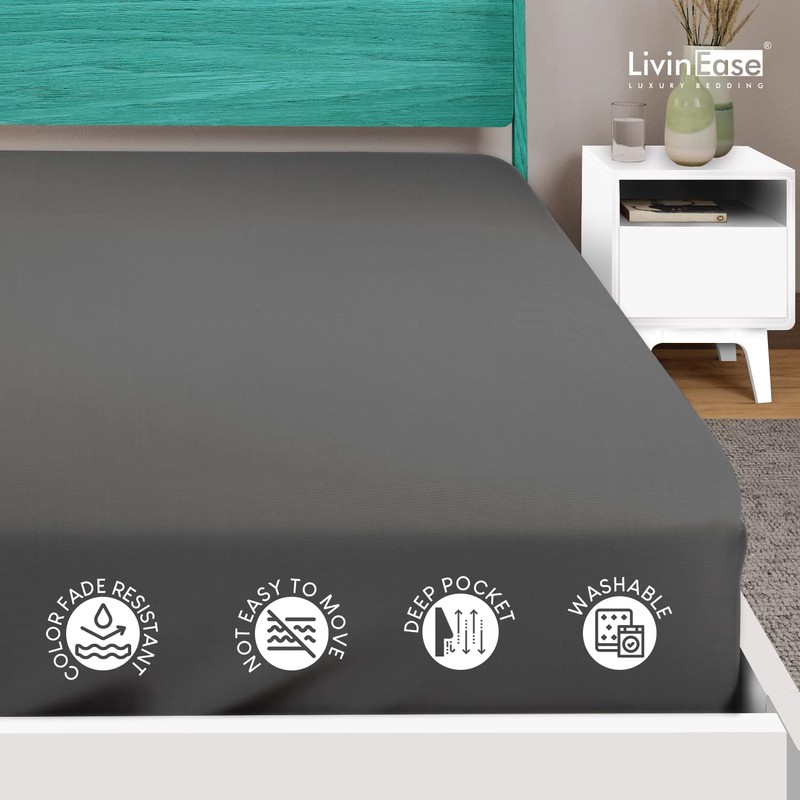 - SIZE AND VARIETY - LivinEase offers UK Standard Sizes for Single Fitted Sheet (90x190cm), Double Fitted Sheet (135x190cm), King size Fitted Sheet (150x200cm), Super King Fitted Sheet (183x200cm). These 26cm deep pockets sheets have elastic at the corners so snug fit around your mattress and give a comfy yet cozy feeling. Available in 5 Colors White, Silver, Cream, Charcoal and Black