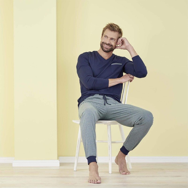 The long-sleeved shirt with V-neck and a small patch chest pocket ensures a timeless design. The trousers with drawstring and the wide cuffs on the feet ensure a comfortable fit.