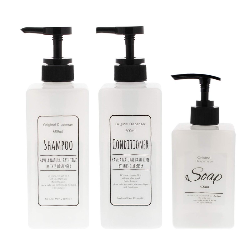 - Set Includes: Shampoo bottle x 1, conditioner bottle x 1, soap bottle (regular type) x 1