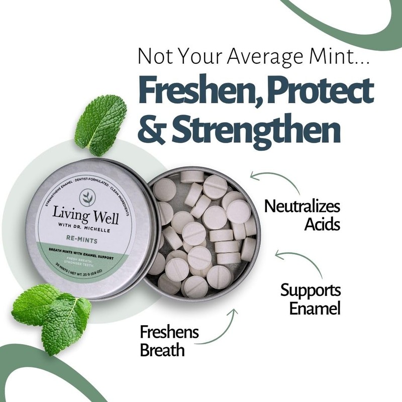 RE-MINTS by Living Well with Dr. Michelle are fluoride-free breath mints designed to support enamel strength and oral wellness on the go. Formulated by a holistic dentist, these clean mints contain hydroxyapatite, xylitol, and PROtektinDa proprietary prebiotic complexDto help maintain a healthy oral environment between brushing.Each mint offers a refreshing peppermint flavor while working with your body's natural systems to help freshen breath and support tooth strength. Made without fluoride, artificial sweeteners, SLS, or synthetic fillers, these remineralizing mints are ideal for anyone looking for a health-conscious oral care solution.Perfect for travel, work, school, or after meals. Great for adults and kids alike. Dentist-developed and made with clean, effective ingredients you can trust. Support your smile anywhere, anytime with RE-MINTS.