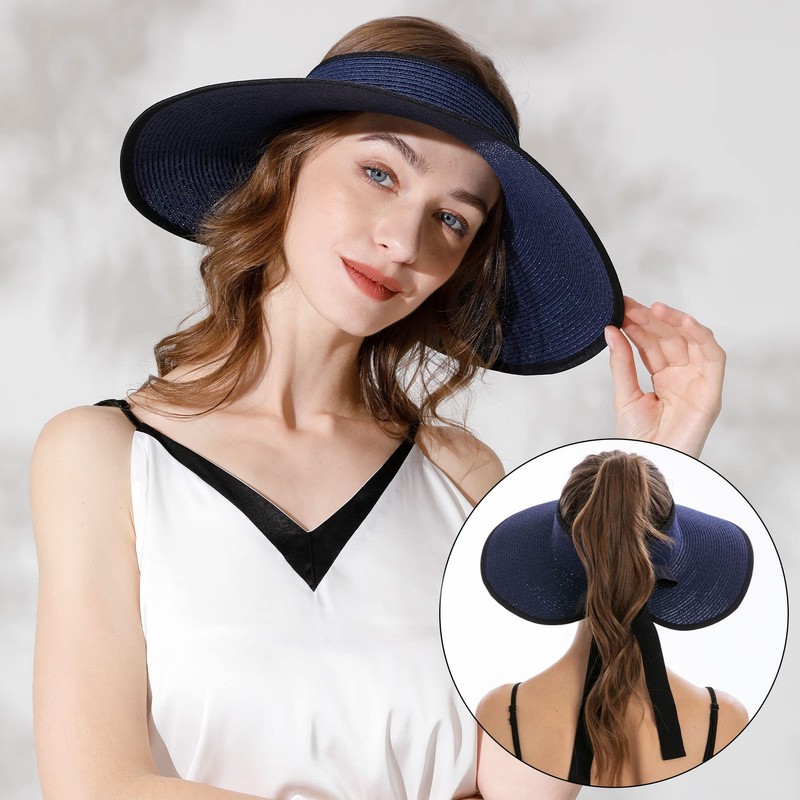Livingston Straw Visors for Women Roll Up Wide Brim Foldable Sun Hat for Women with Ponytail Hole Beach Visor Straw Hats Blue Navy