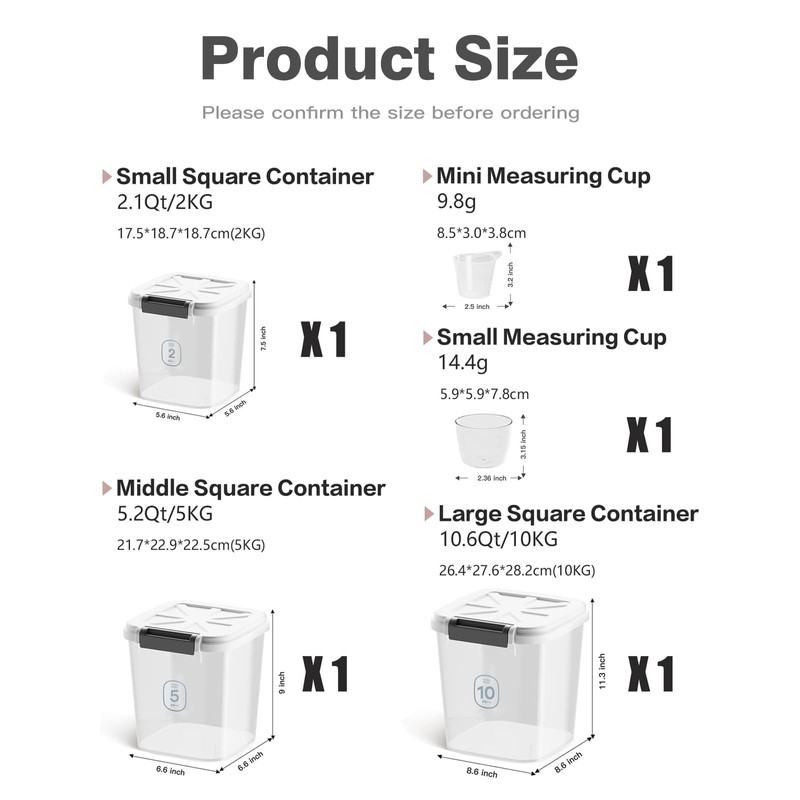 - 3 in1 Set for Different Needs : Our Pet Food Storage Containers come in convenient sets of 2 kg, 5 kg, and 10 kg sizes, offering flexible options for organizing pet supplies. Whether it's for pet treats or pet food,and whether it's for indoor storage or outdoor portability. Moreover,these containers are also suitable for storing rice,flours,grains and cereals.