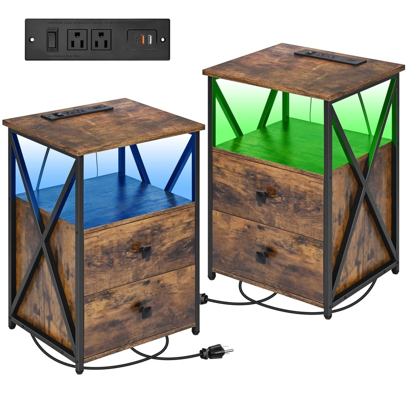 Livofloral LED Nightstands Set 2, Night Stand with Charging Station, End Table Set 2 with Storage, Side Table with USB Ports and Outlets, Bedside Table with Wood Drawer for Bedroom, Brown